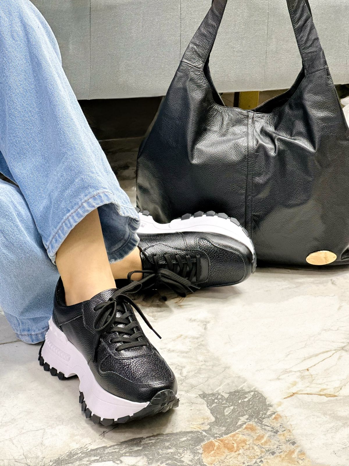 Los tenis Kathar en color Negro son una fusión perfecta de estilo, comodidad y elegancia. Elaborados en cuero de alta calidad, destacan por su textura suave y su acabado impecable. Aporta un toque sofisticado y moderno que los convierte en el complemento ideal para cualquier ocasión.
