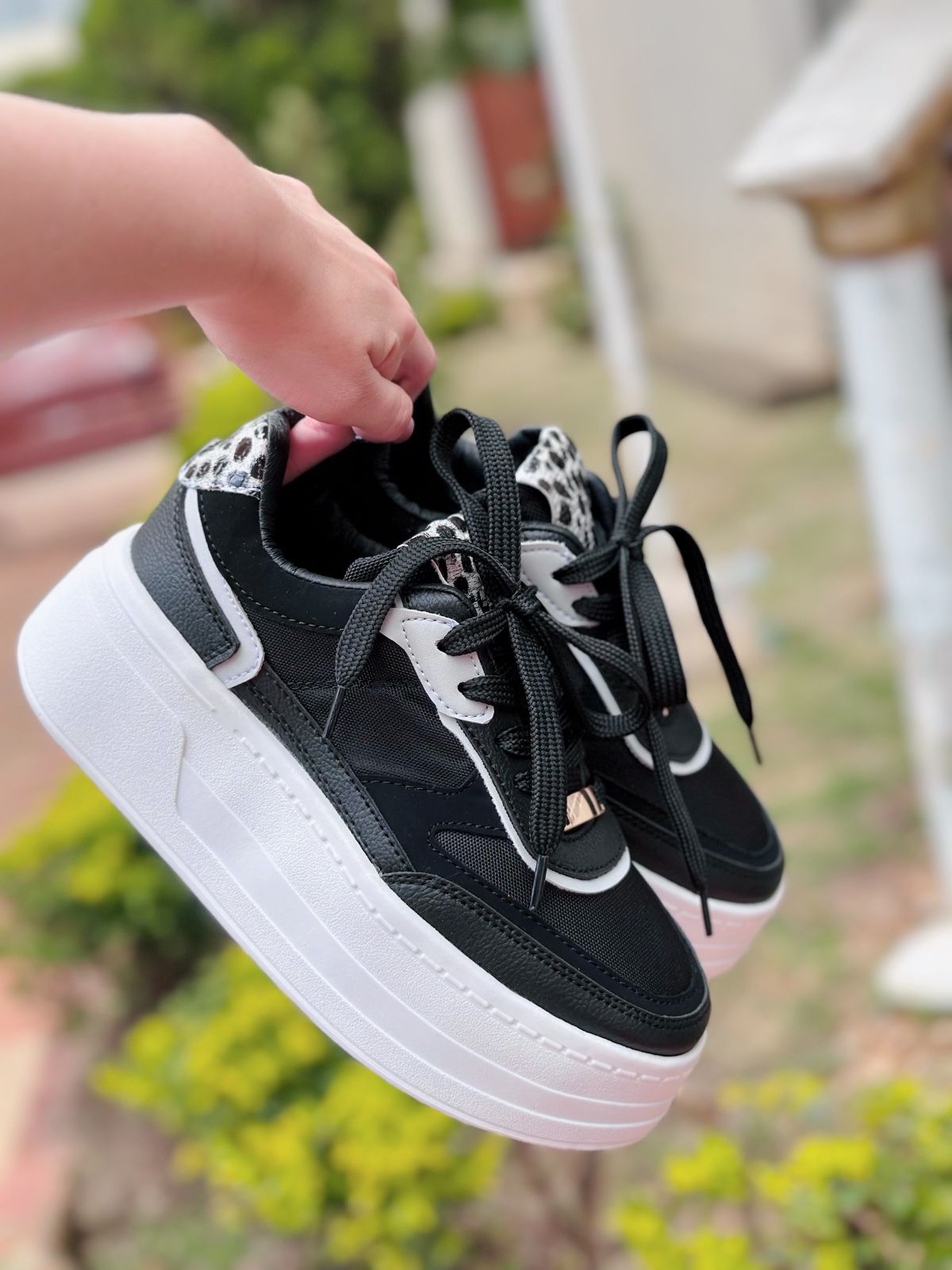 Tenis Kira en material sintético de excelente calidad, con diseño moderno y sofisticado que se adapta a cualquier ocasión. Su suela de 5 cm brinda altura y comodidad, mientras que los detalles en contraste y acabados impecables realzan tu estilo urbano
