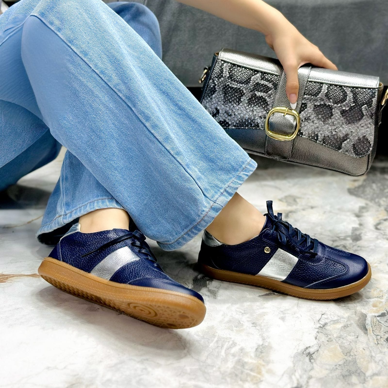 Los tenis Maki en cuero tono Azul destacan por su diseño moderno y elegante, combinados en los laterales y parte trasera con color Plateado que crea un contraste perfecto. Su suela en café aporta un estilo casual y versátil, ideal para el día a día. Cuentan con interior abullonado en material sintético y plantilla confort, lo que garantiza suavidad y comodidad en cada paso. Una opción que fusiona estilo, calidad y confort para acompañarte en cualquier ocasión.