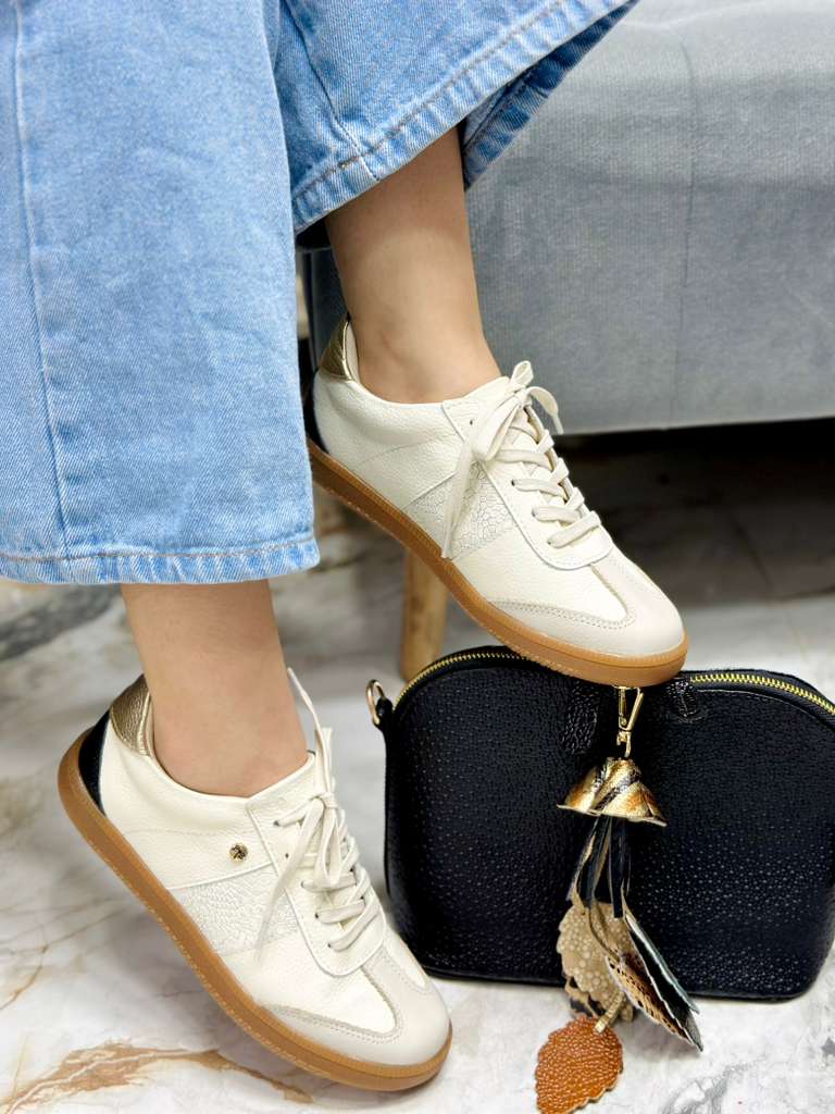 Los tenis Maki en cuero tono Talco destacan por su diseño moderno y elegante, combinados en los laterales y parte trasera con color Dorado y negro que crea un contraste perfecto. Su suela en café aporta un estilo casual y versátil, ideal para el día a día. Cuentan con interior abullonado en material sintético y plantilla confort, lo que garantiza suavidad y comodidad en cada paso. Una opción que fusiona estilo, calidad y confort para acompañarte en cualquier ocasión.