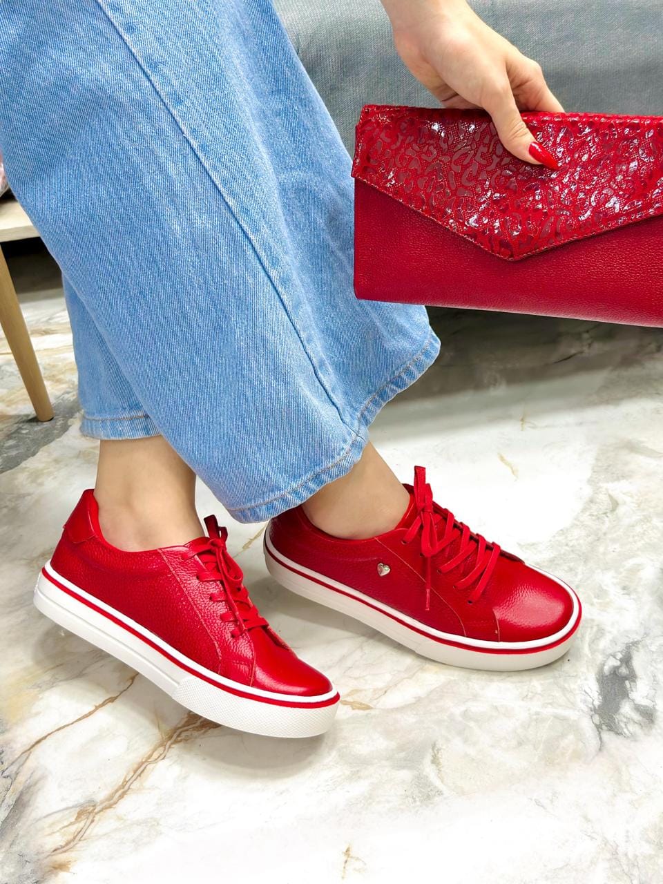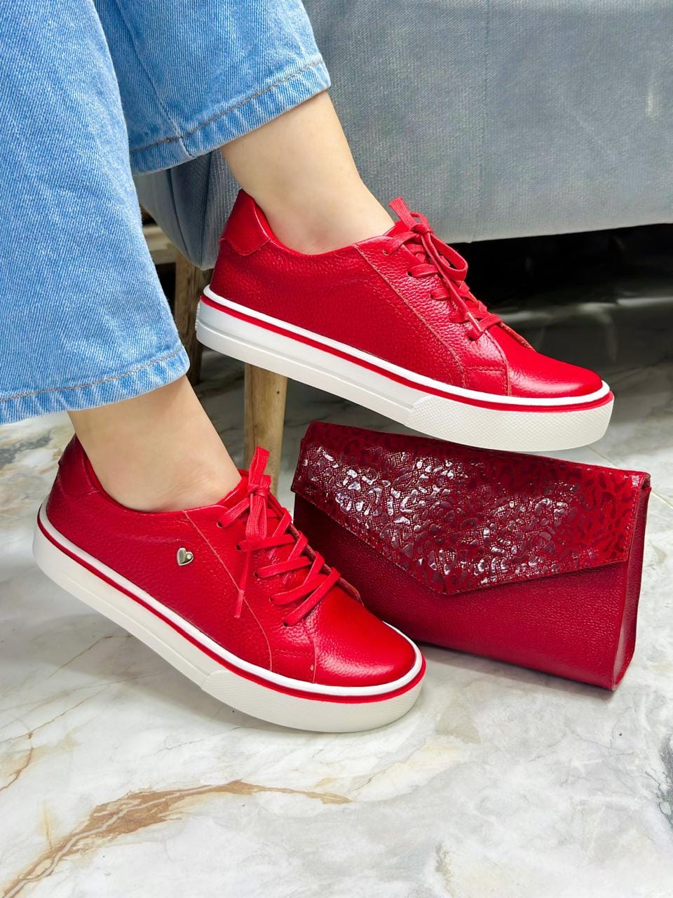 Luce con estilo los tenis Margaret en color rojo, elaborados en cuero de alta calidad. Su diseño con suela tipo Vans y cordones al tono los hace perfectos para combinar con cualquier outfit. Además, cuentan con un abullonado interno que brinda mayor comodidad en cada paso, ideales para acompañarte con estilo durante todo el día.