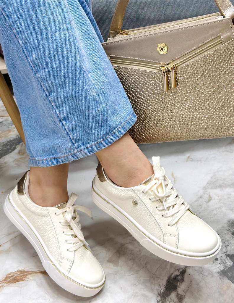 Luce con estilo los tenis Margaret en color Talco con dorado, elaborados en cuero de alta calidad. Su diseño con suela tipo Vans y cordones al tono los hace perfectos para combinar con cualquier outfit. Además, cuentan con un abullonado interno que brinda mayor comodidad en cada paso, ideales para acompañarte con estilo durante todo el día.
