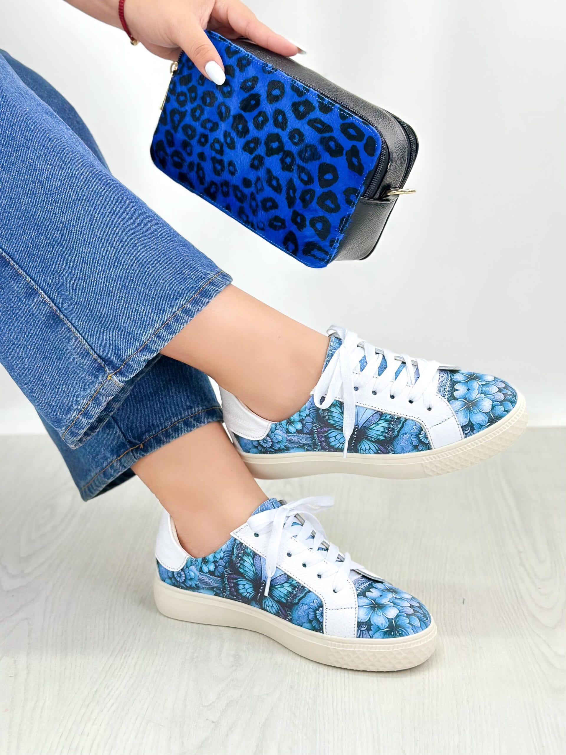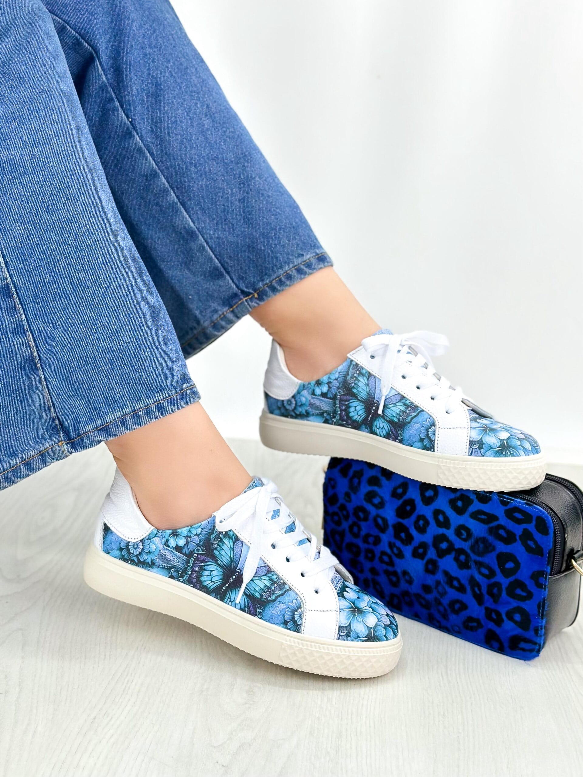Los tenis Milu en color Blanco destacan por su elegante diseño estampado con mariposas y flores en tonos azules, que aporta un toque femenino y original. Fabricados en cuero de alta calidad, cuentan con un interior abullonado en material sintético que brinda una comodidad excepcional en cada paso. Su armoniosa combinación de colores entre el capuchino del cuerpo y el café de la suela crea un contraste visual sofisticado y versátil, ideal para elevar cualquier look casual o urbano