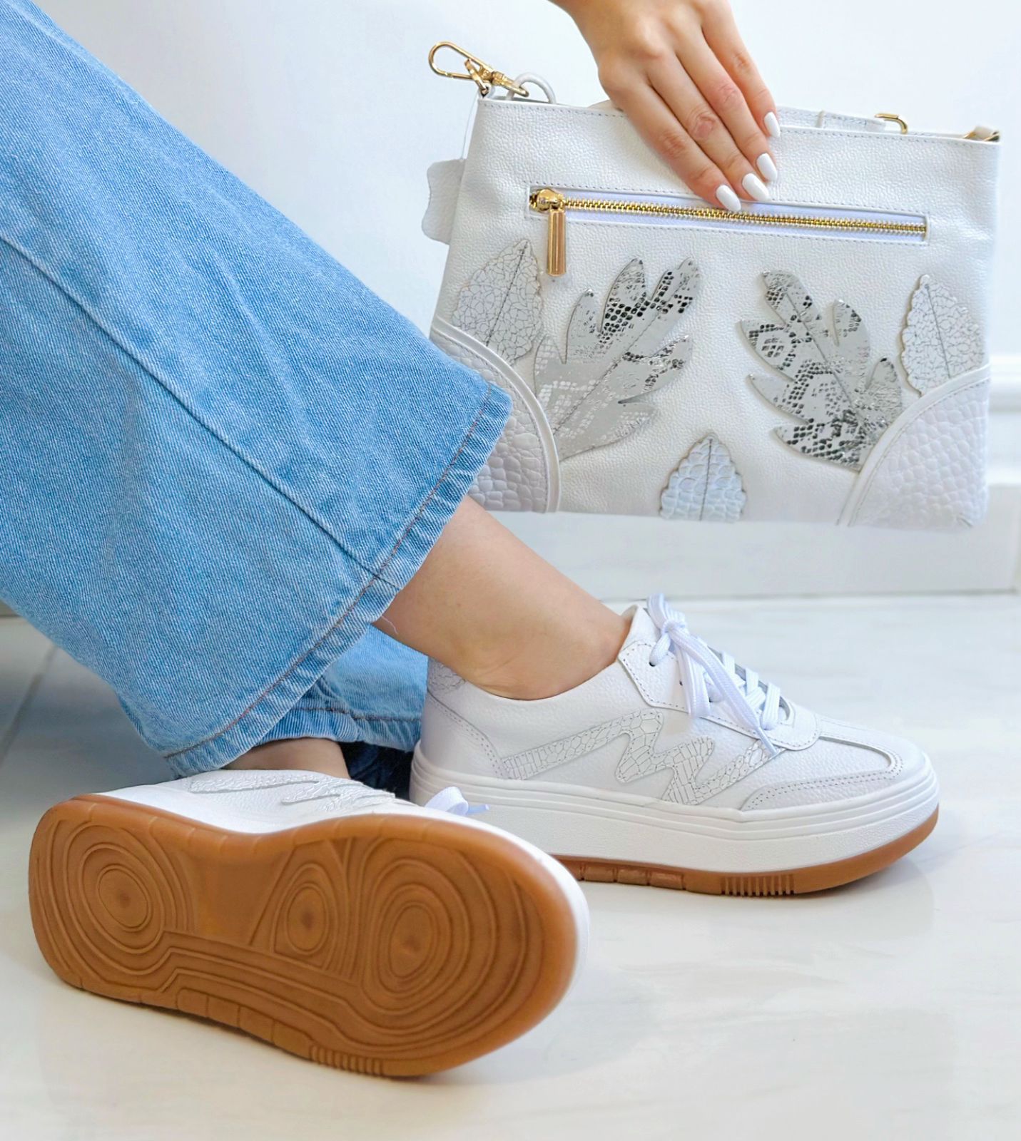 Dale brillo a tus pasos con estos elegantes tenis en cuero metalizado color Blanco. Su diseño sofisticado se complementa con una textura tipo reptil en el costado que forma un sutil rayo, añadiendo un toque moderno y exclusivo. La suela alta blanca con base caramelo proporciona confort y estilo, ideal para caminar con seguridad y lucir fabulosa todo el día. Incluye cordones en tono Blanco que aportan un contraste delicado y femenino.
