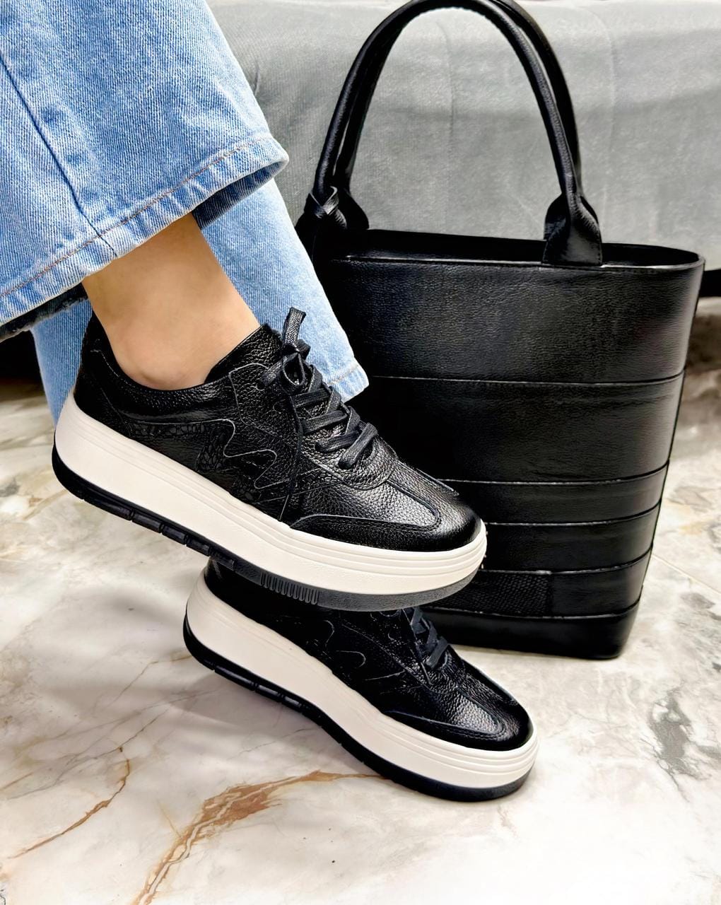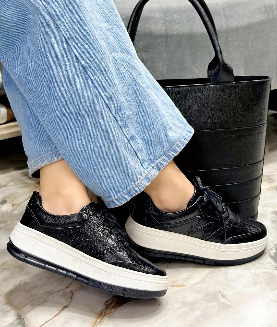 Dale brillo a tus pasos con estos elegantes tenis en cuero metalizado color Negro . Su diseño sofisticado se complementa con una textura tipo reptil en el costado que forma un sutil rayo, añadiendo un toque moderno y exclusivo. La suela alta crema con base negro proporciona confort y estilo, ideal para caminar con seguridad y lucir fabulosa todo el día. Incluye cordones en tono Blanco que aportan un contraste delicado y femenino.