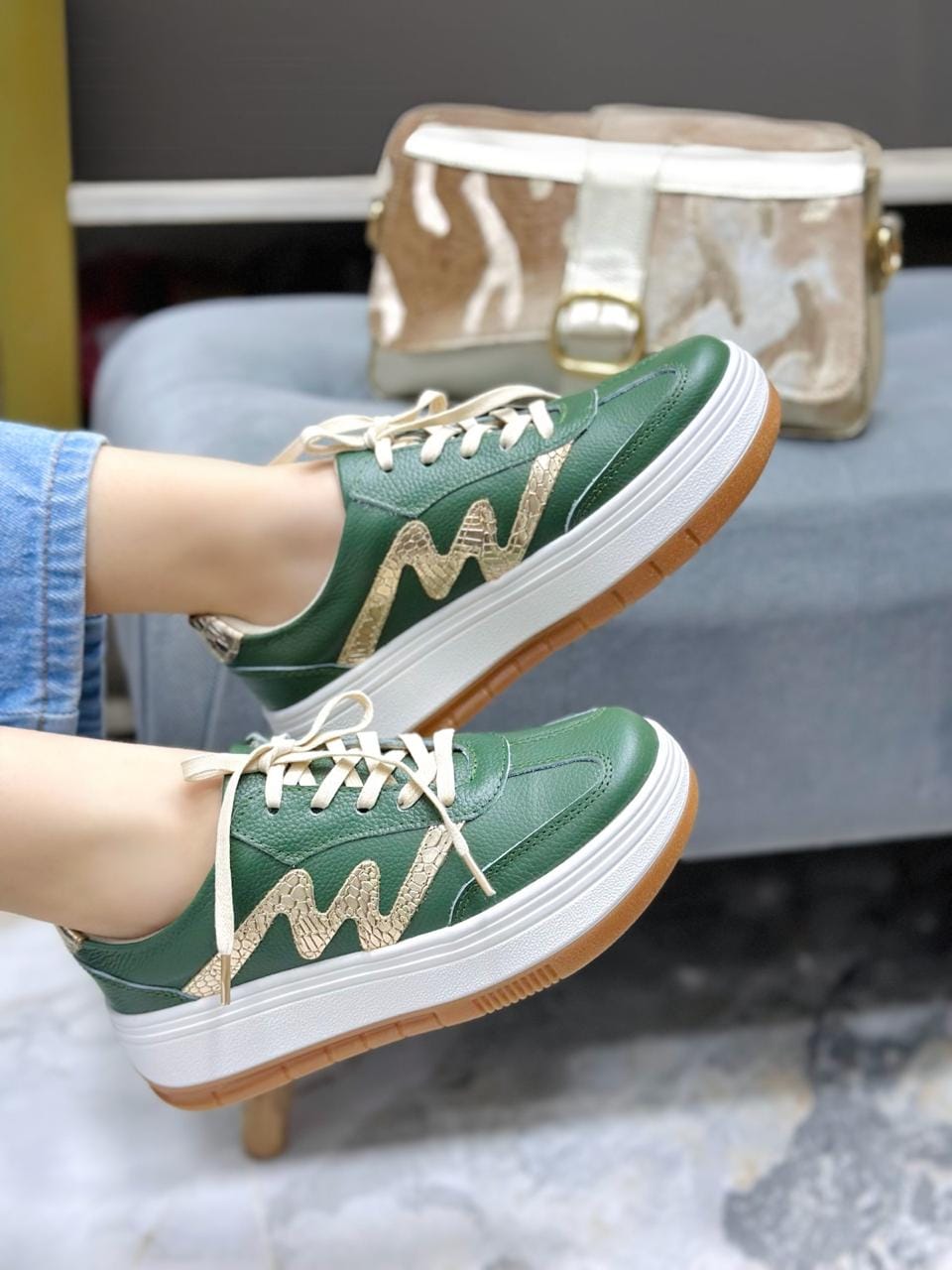 Dale brillo a tus pasos con estos elegantes tenis en cuero metalizado color Verde. Su diseño sofisticado se complementa con una textura tipo reptil en el costado que forma un sutil rayo color Dorado, añadiendo un toque moderno y exclusivo. La suela alta blanca con base cafe proporciona confort y estilo, ideal para caminar con seguridad y lucir fabulosa todo el día. .