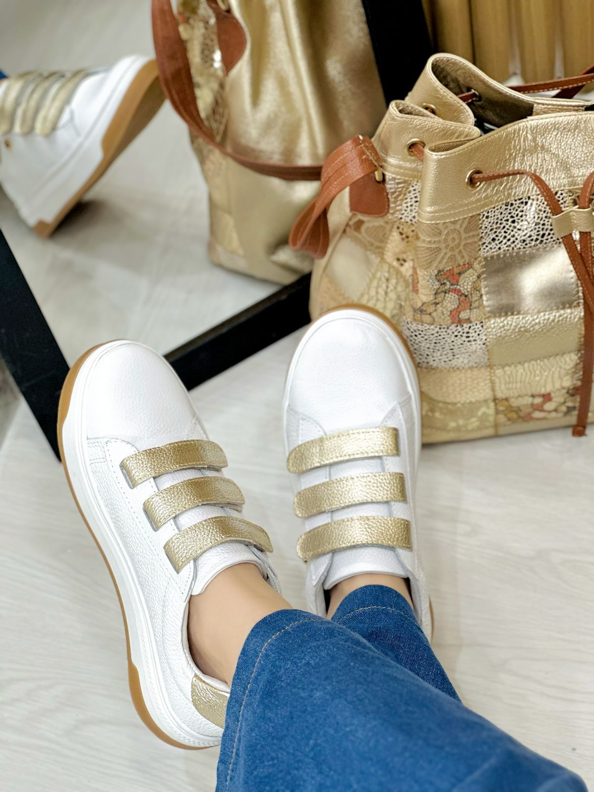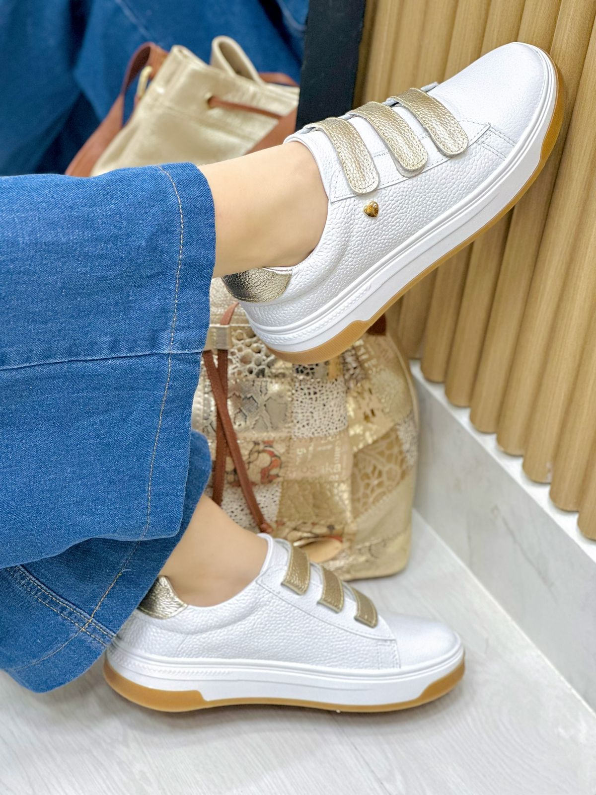 Los tenis Norah combinan practicidad y estilo en un diseño moderno y versátil. Fabricados 100% en cuero, ofrecen durabilidad y un acabado sofisticado. Su sistema de cierre en velcro permite una postura fácil y rápida, brindando comodidad en cada uso. En color blanco y dorado, se convierten en un básico infaltable que complementa cualquier look con un toque limpio y elegante.