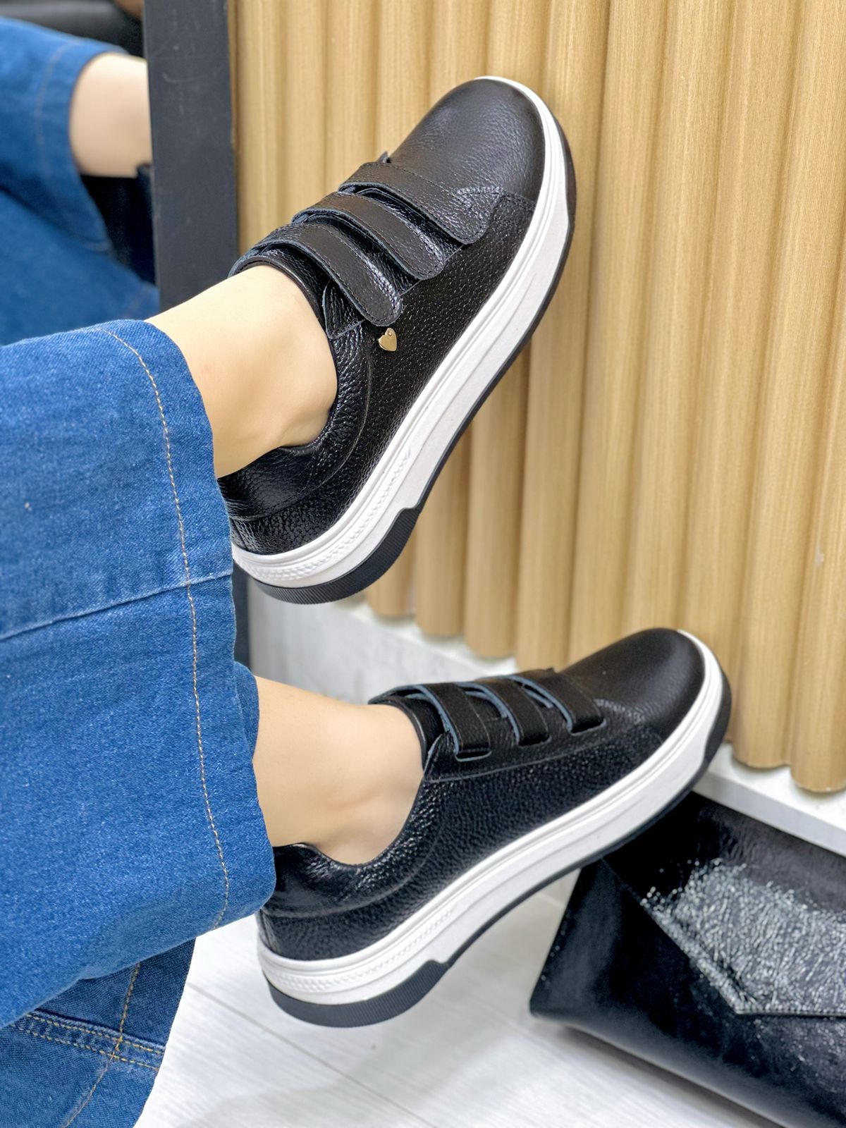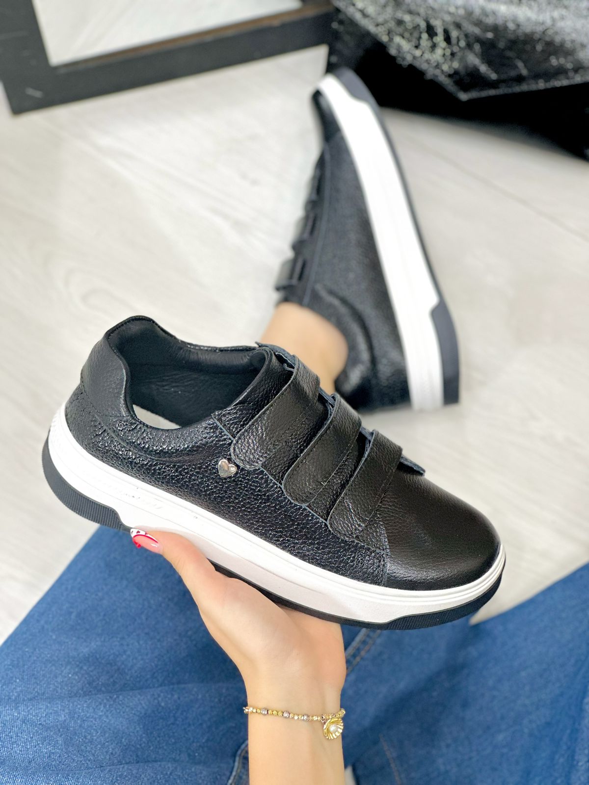 Los tenis Norah combinan practicidad y estilo en un diseño moderno y versátil. Fabricados 100% en cuero, ofrecen durabilidad y un acabado sofisticado. Su sistema de cierre en velcro permite una postura fácil y rápida, brindando comodidad en cada uso. En color Negro , se convierten en un básico infaltable que complementa cualquier look con un toque limpio y elegante