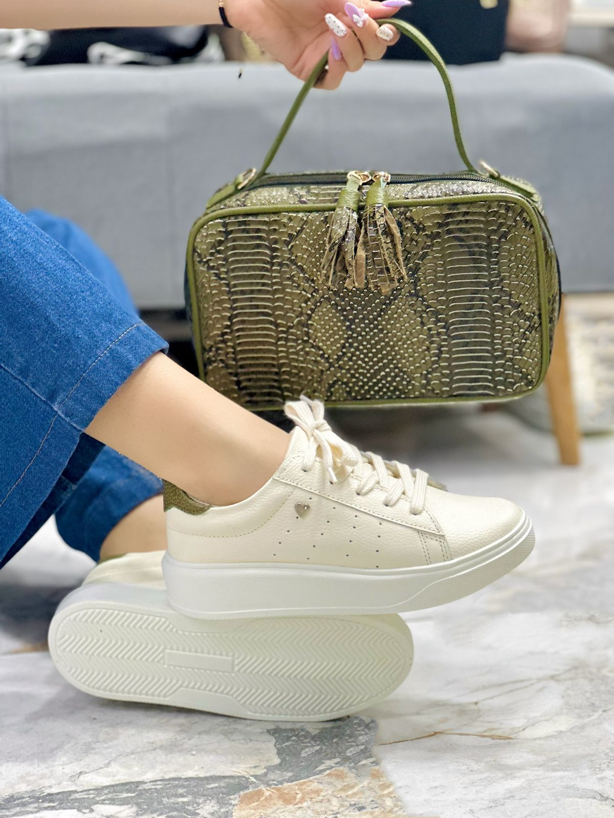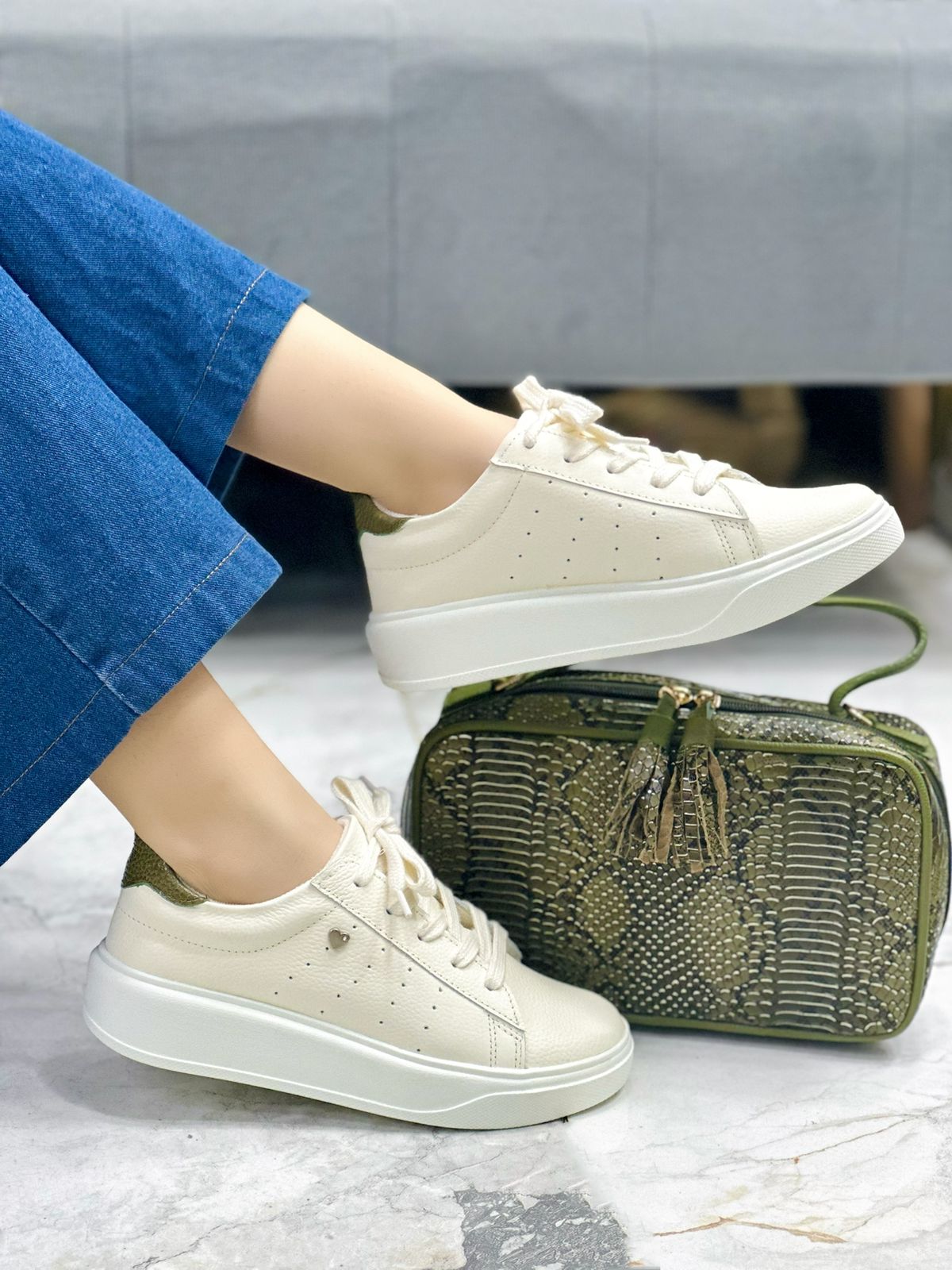 Los tenis Paris en cuero color talco destacan por su diseño limpio, moderno y atemporal. Incorporan una pieza en la parte trasera en tono Verde que aporta un contraste sutil y sofisticado, ideal para elevar cualquier look. Su suela ligeramente alta brinda mayor comodidad y soporte, haciéndolos perfectos para el uso diario. Los Paris son versátiles, fáciles de combinar y pensados para acompañarte con estilo y confort en cada paso.