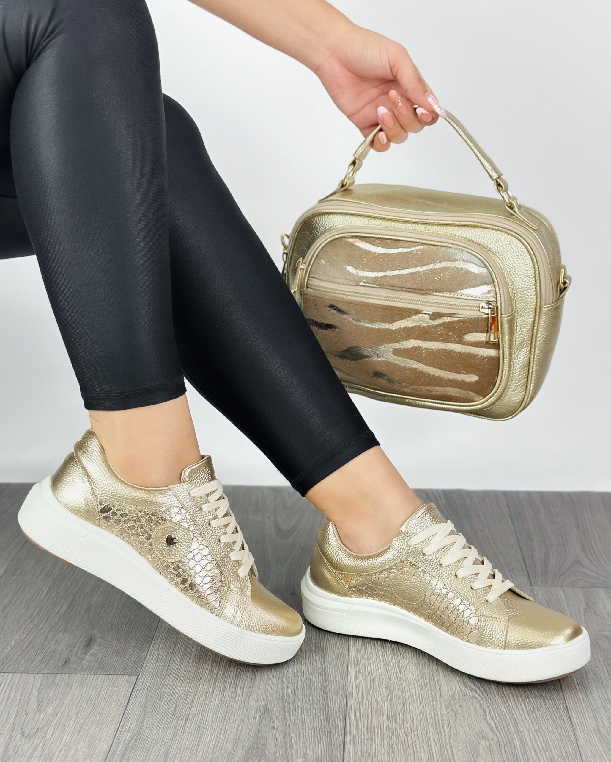 Los tenis Path Dorado Talipe son la opción ideal para quienes buscan un toque de distinción y estilo. Confeccionados completamente en cuero de alta calidad, estos tenis destacan por su elegante tono dorado, perfecto para agregar un toque de sofisticación a cualquier look. Además, cuentan con una plantilla confort que garantiza comodidad durante todo el día, adaptándose a la forma del pie para ofrecer un soporte excepcional. Su diseño exclusivo combina lujo y funcionalidad, convirtiéndolos en el calzado perfecto para quienes desean destacar sin sacrificar confort.