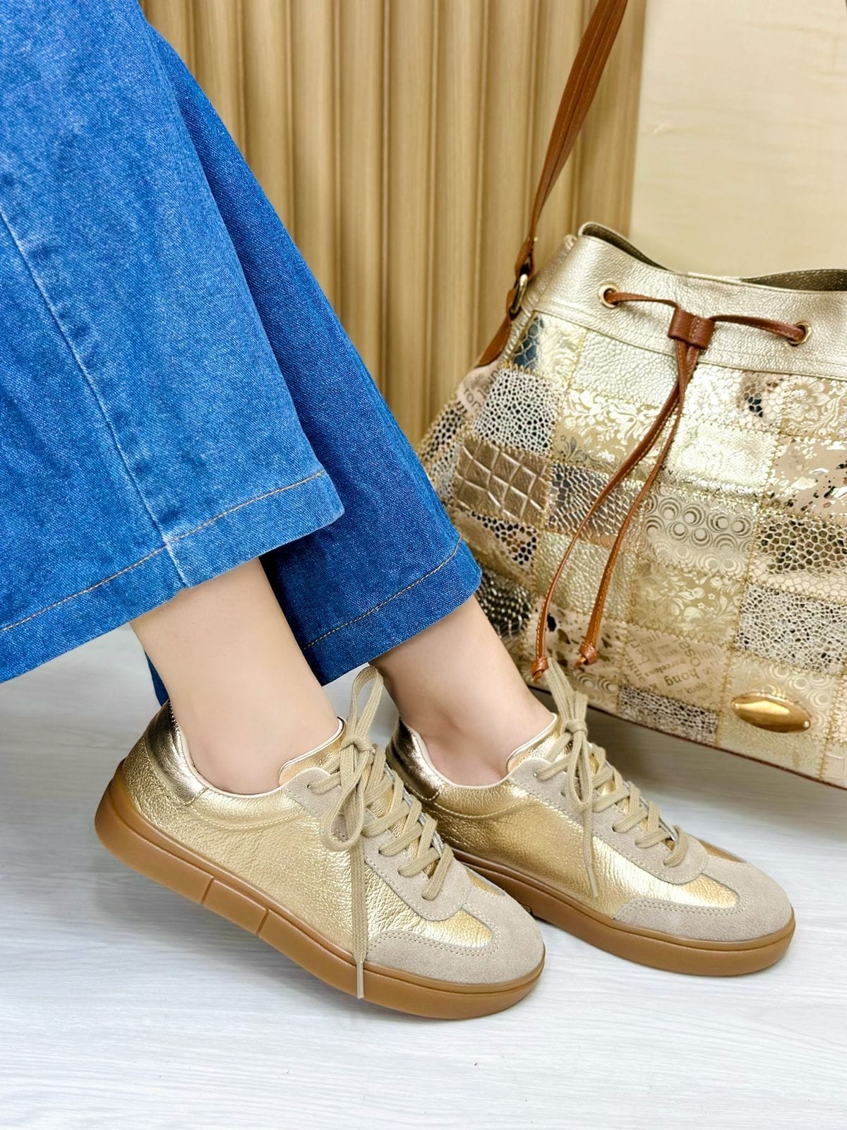 Los tenis Regina son la combinación perfecta de estilo casual y elegancia sutil. Elaborados en cuero Dorado y Carnaza en un sofisticado tono arena, ofrecen una textura suave y un acabado natural que aporta frescura y versatilidad a cualquier look.