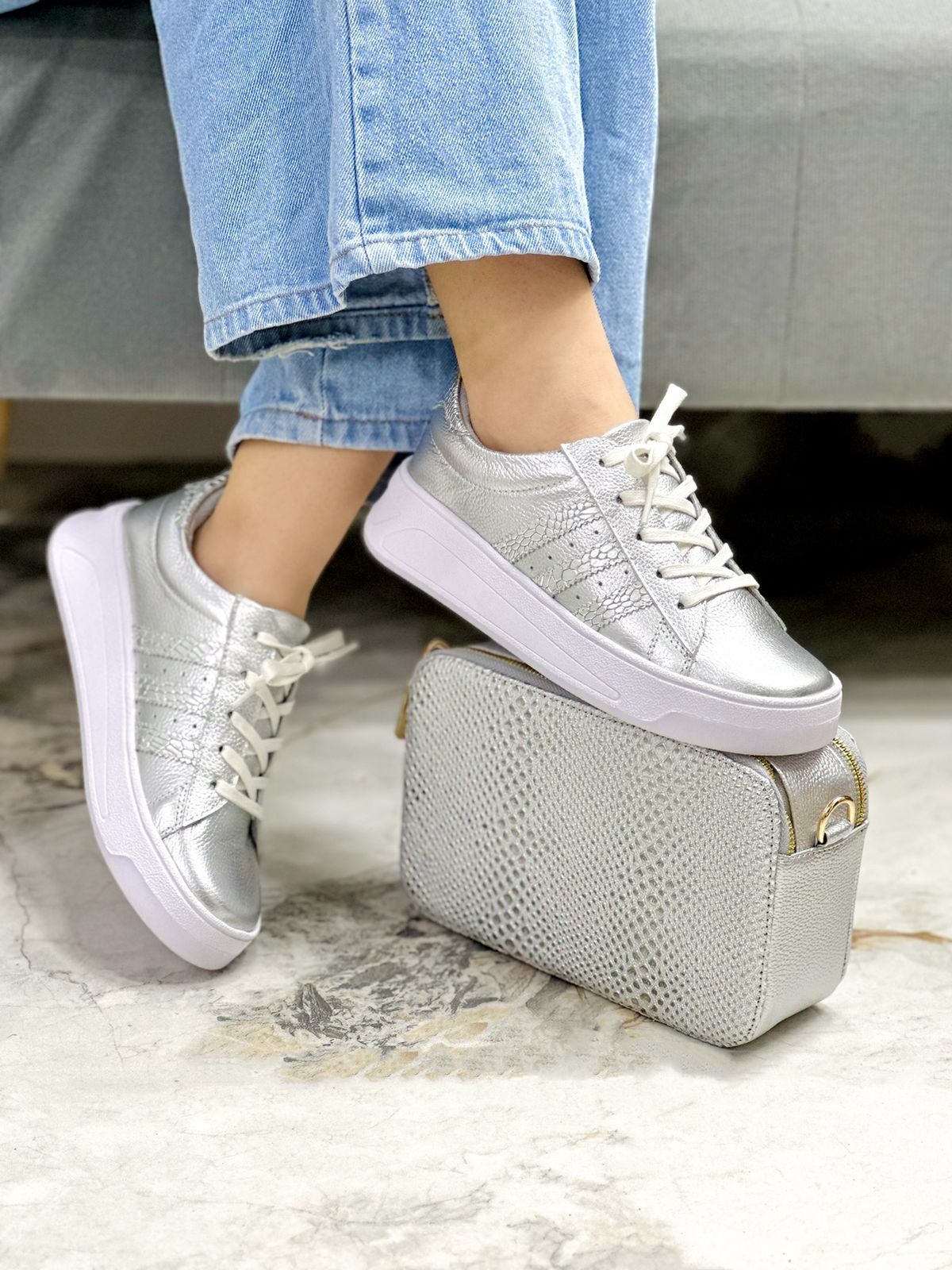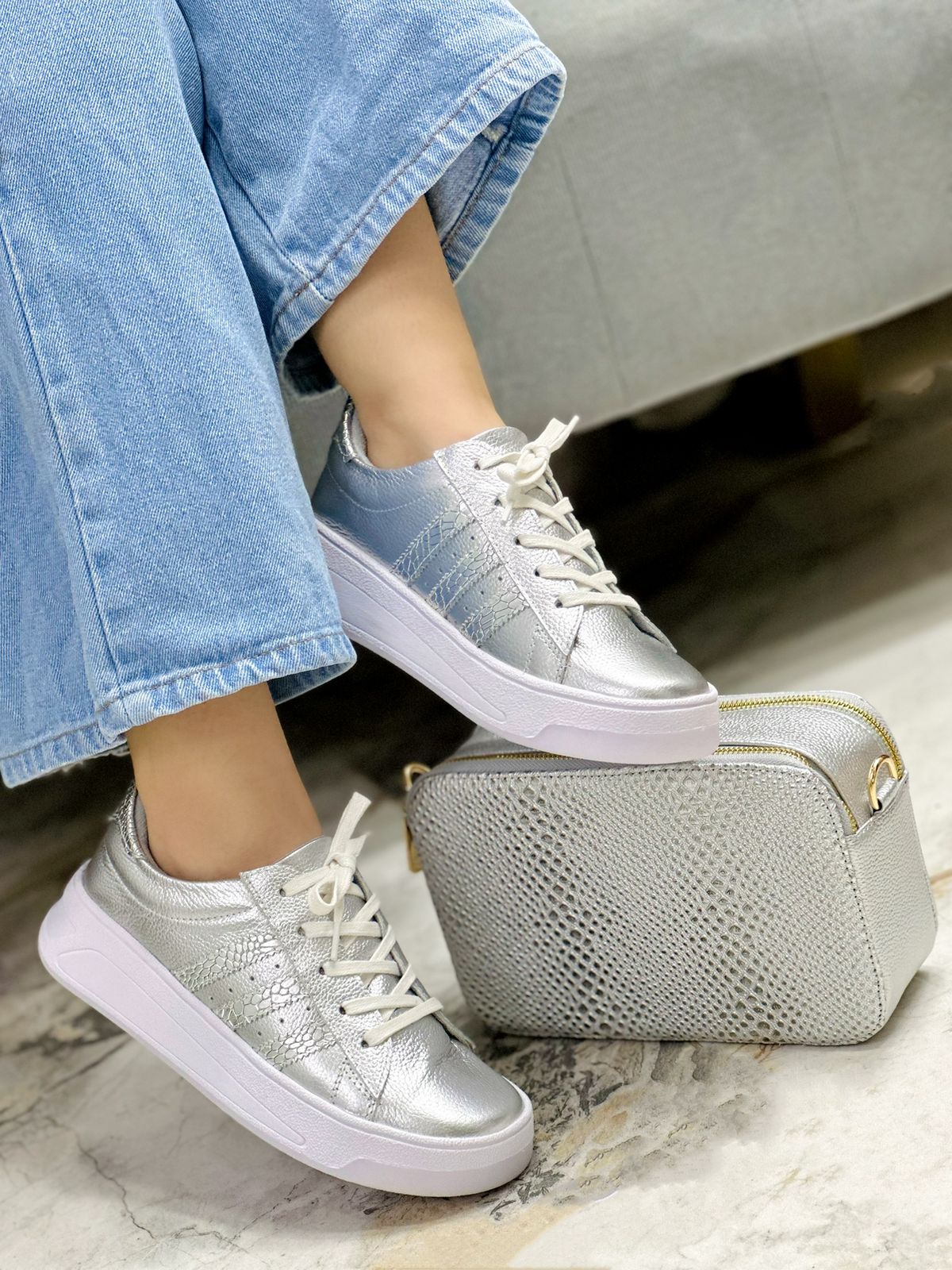 Los tenis Sasha están fabricados en cuero en un elegante tono Plateado, ideales para quienes buscan estilo y confort en un mismo diseño. Su combinación de texturas en el cuero resalta su sofisticación, mientras que su interior cuenta con abullonado en espuma, brindando una sensación de máxima comodidad en cada paso. La suela blanca complementa perfectamente el diseño, logrando un look moderno y versátil para cualquier ocasión.