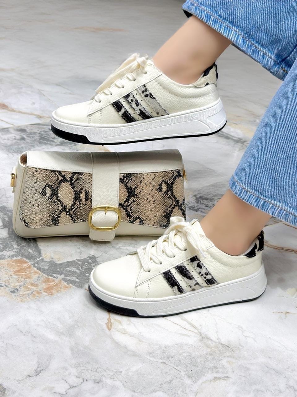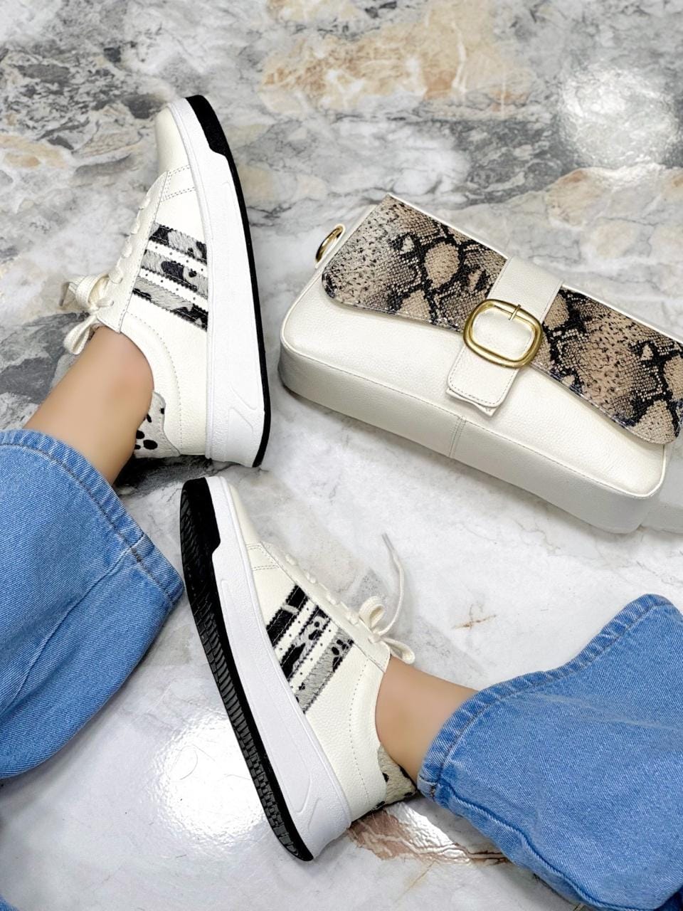 Los tenis Sasha en color talco combinados con líneas en print animal y detalles en negro a los lados son la mezcla perfecta entre estilo urbano y versatilidad. Su diseño moderno en cuero aporta resistencia y personalidad, mientras que su suela cómoda y ligera asegura confort durante todo el día. Ideales para darle un toque audaz a tus looks diarios, estos tenis son la elección perfecta para quienes buscan destacar con autenticidad y estilo.