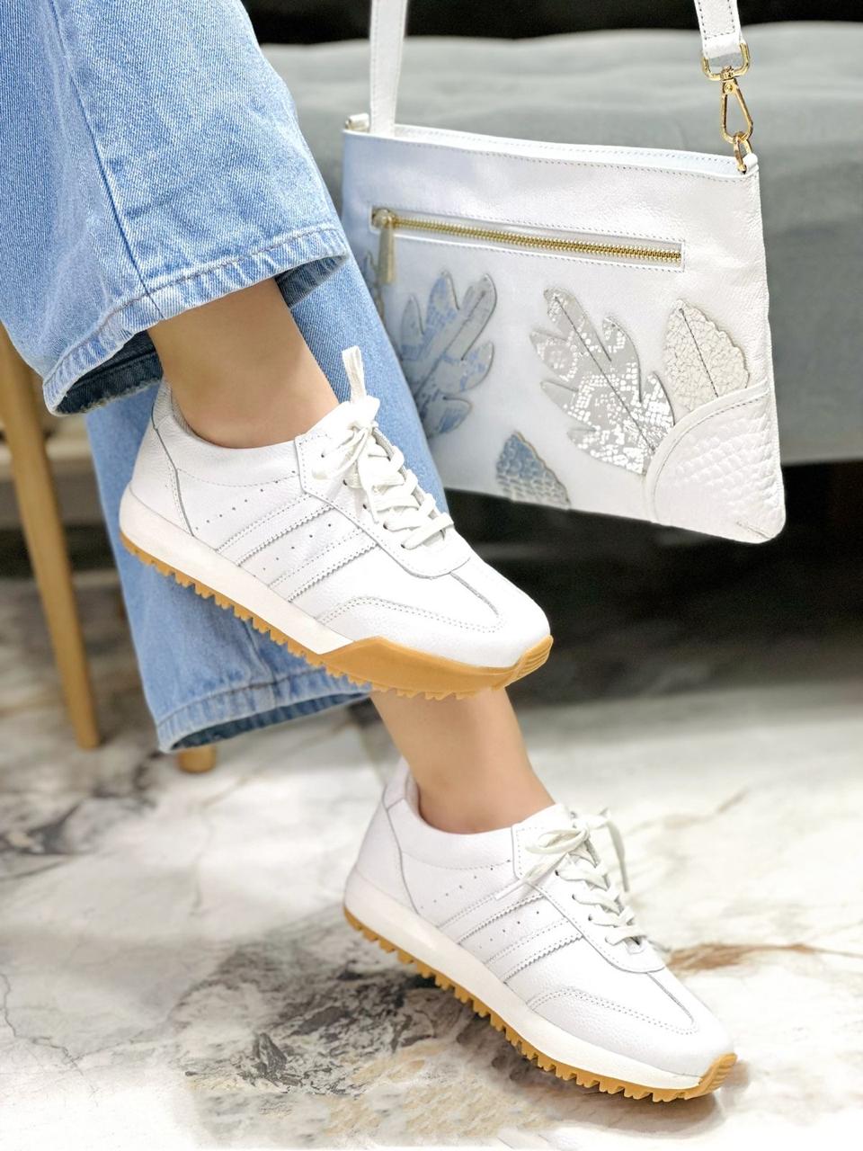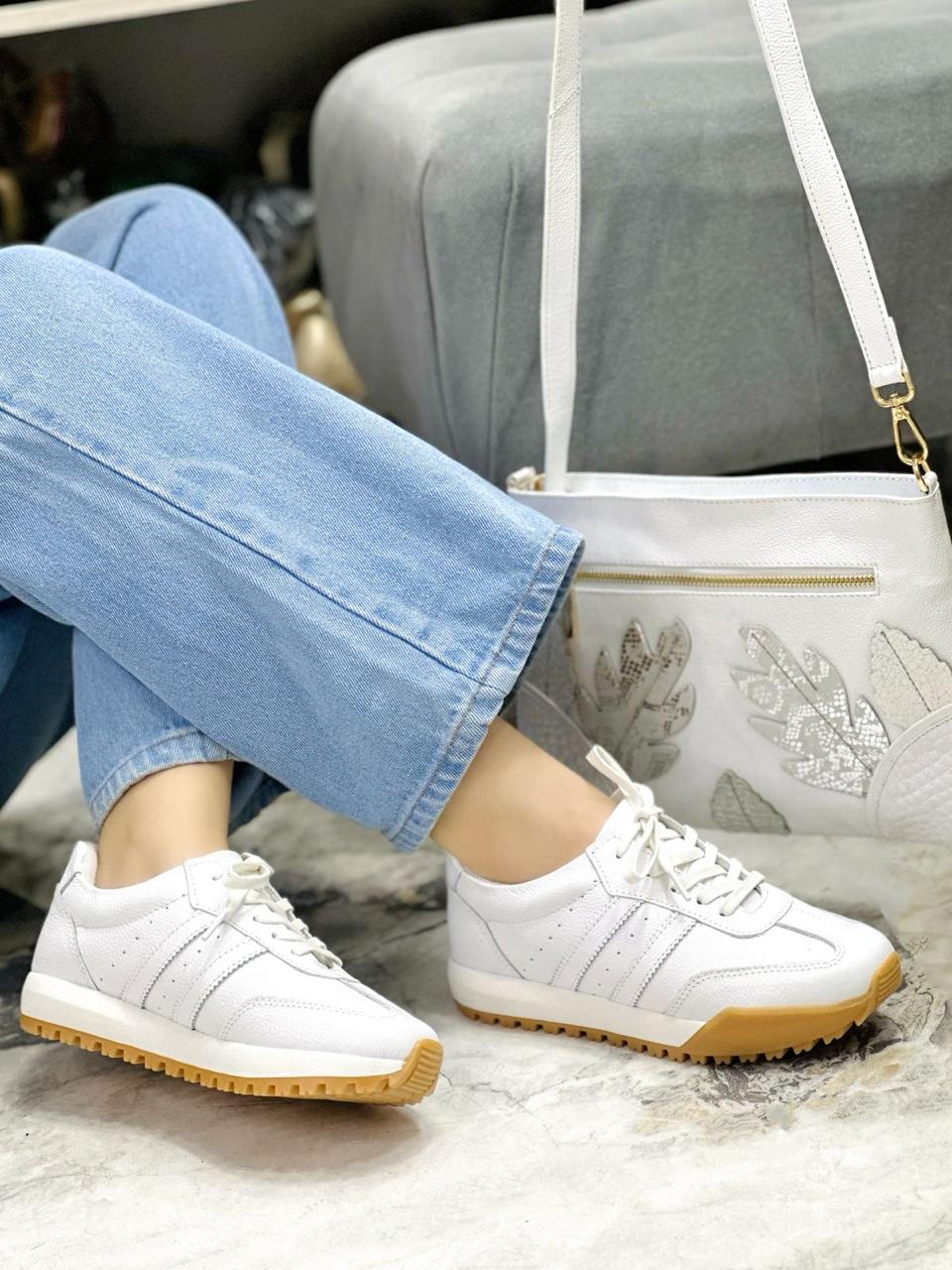 Descubre los tenis Selene Blanco x Caramelo, elaborados en cuero de alta calidad. Su diseño sofisticado y su suela distintiva aportan un estilo único y moderno. El interior con abullonado en cuero sintético ofrece una comodidad superior, ideal para el día a día. La combinación de tonos neutros y su suela color caramelo los convierte en el complemento perfecto para cualquier look.