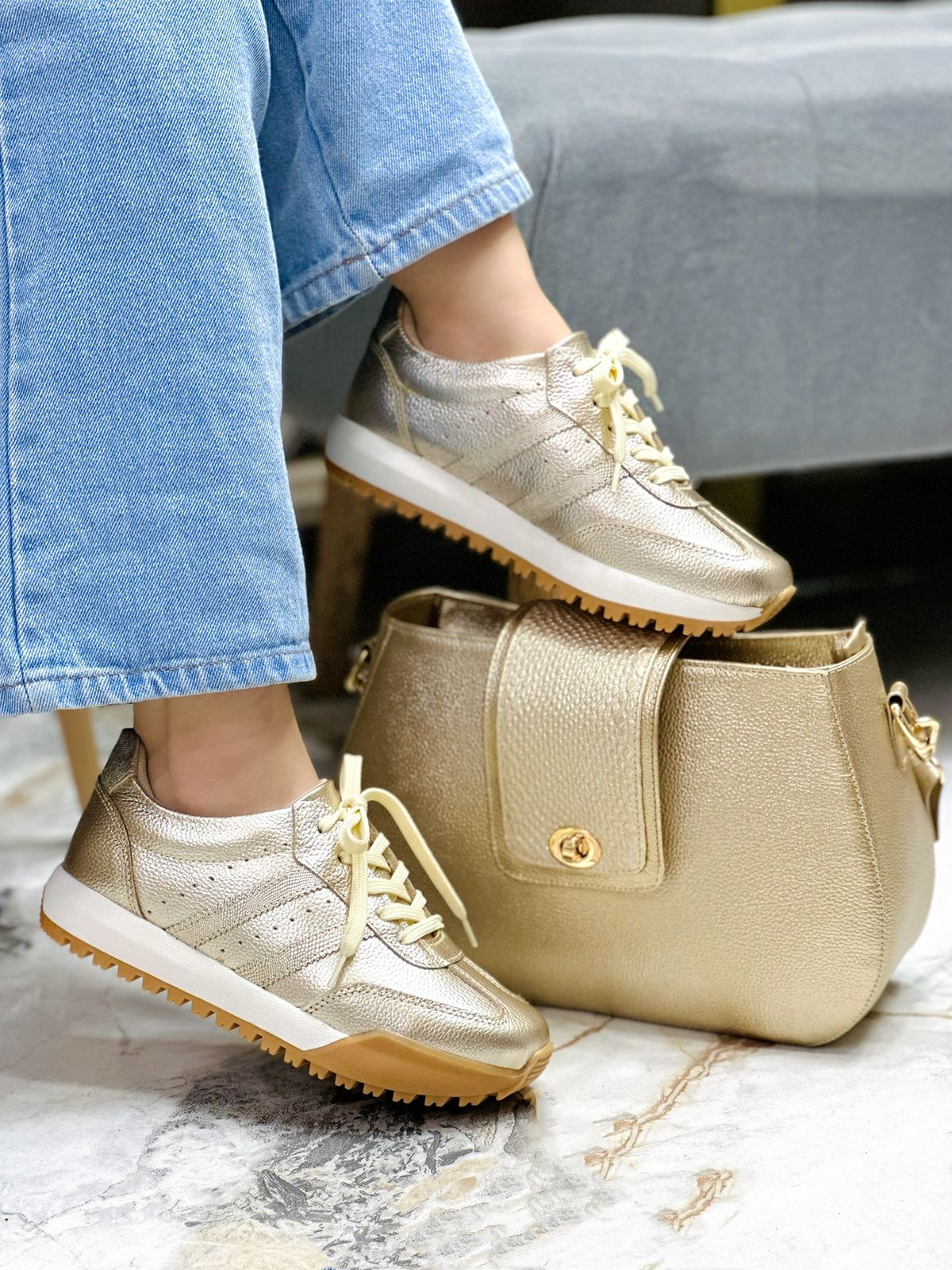 Descubre los tenis Selene en color Dorado, un diseño versátil y moderno que une estilo y comodidad. Su confección en materiales de alta calidad y su suela con excelente tracción los convierten en el aliado perfecto para tus looks casuales y urbanos.