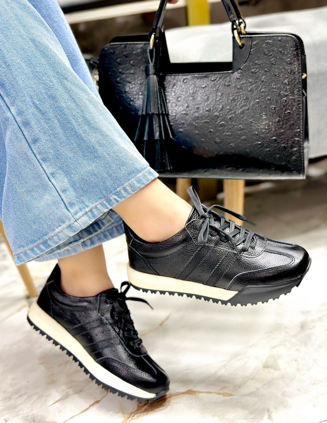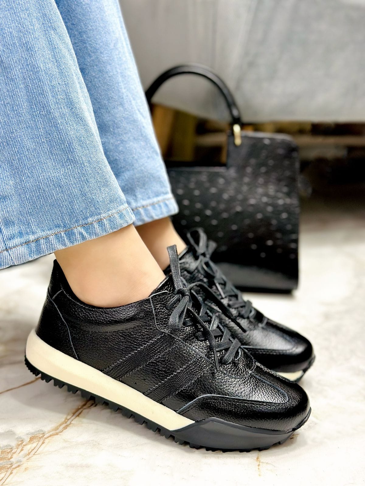 Descubre los tenis Selene en color talco totalmente negro, un diseño versátil y moderno que une estilo y comodidad. Su confección en materiales de alta calidad y su suela con excelente tracción los convierten en el aliado perfecto para tus looks casuales y urbanos.