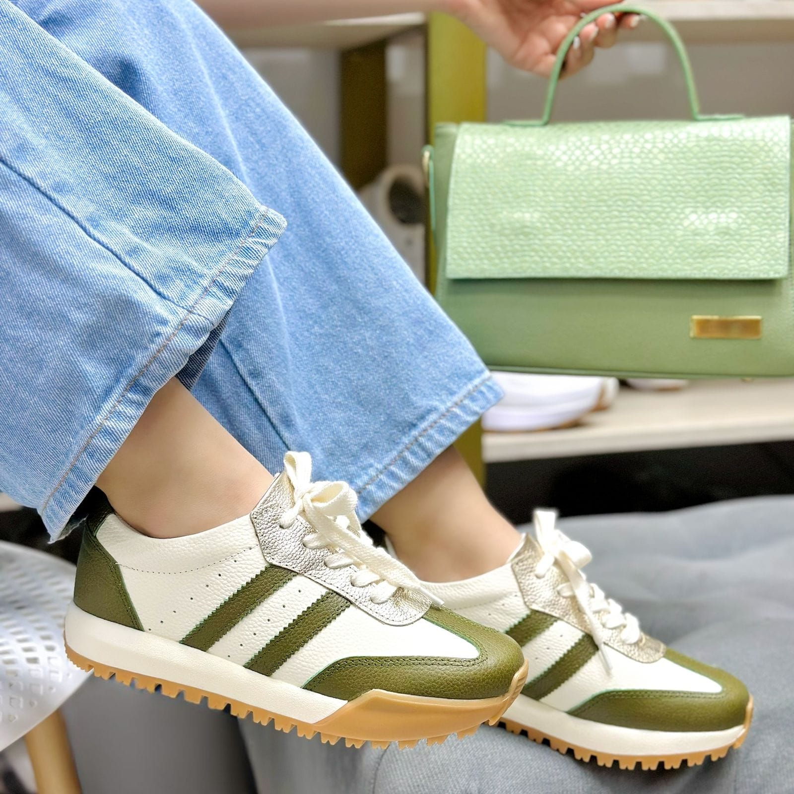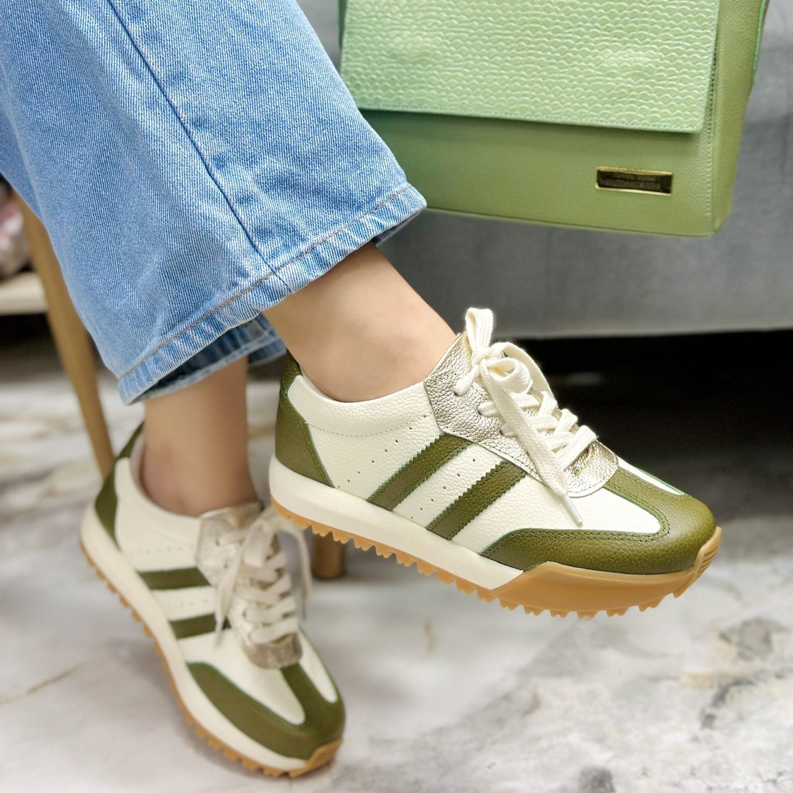 Descubre los tenis Selene en color talco combinados con detalles en verde y cordonera en tono dorado, un diseño versátil y moderno que une estilo y comodidad. Su confección en materiales de alta calidad y su suela con excelente tracción los convierten en el aliado perfecto para tus looks casuales y urbanos.