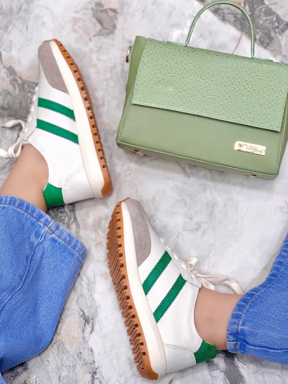 Un diseño fresco y elegante en cuero color talco, con sutiles rayas verdes que recorren los costados y se extienden hasta la parte trasera, aportando un toque natural y armonioso. La combinación de tonos suaves resalta su estilo moderno y versátil, ideal para complementar looks casuales con un aire delicado y sofisticado.