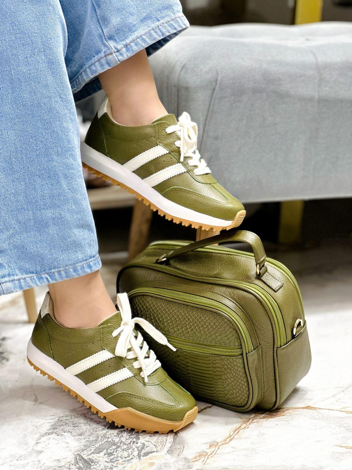 Descubre los tenis Selene en color Verde combinados con detalles en talco y cordonera en tono dorado, un diseño versátil y moderno que une estilo y comodidad. Su confección en materiales de alta calidad y su suela con excelente tracción los convierten en el aliado perfecto para tus looks casuales y urbanos.