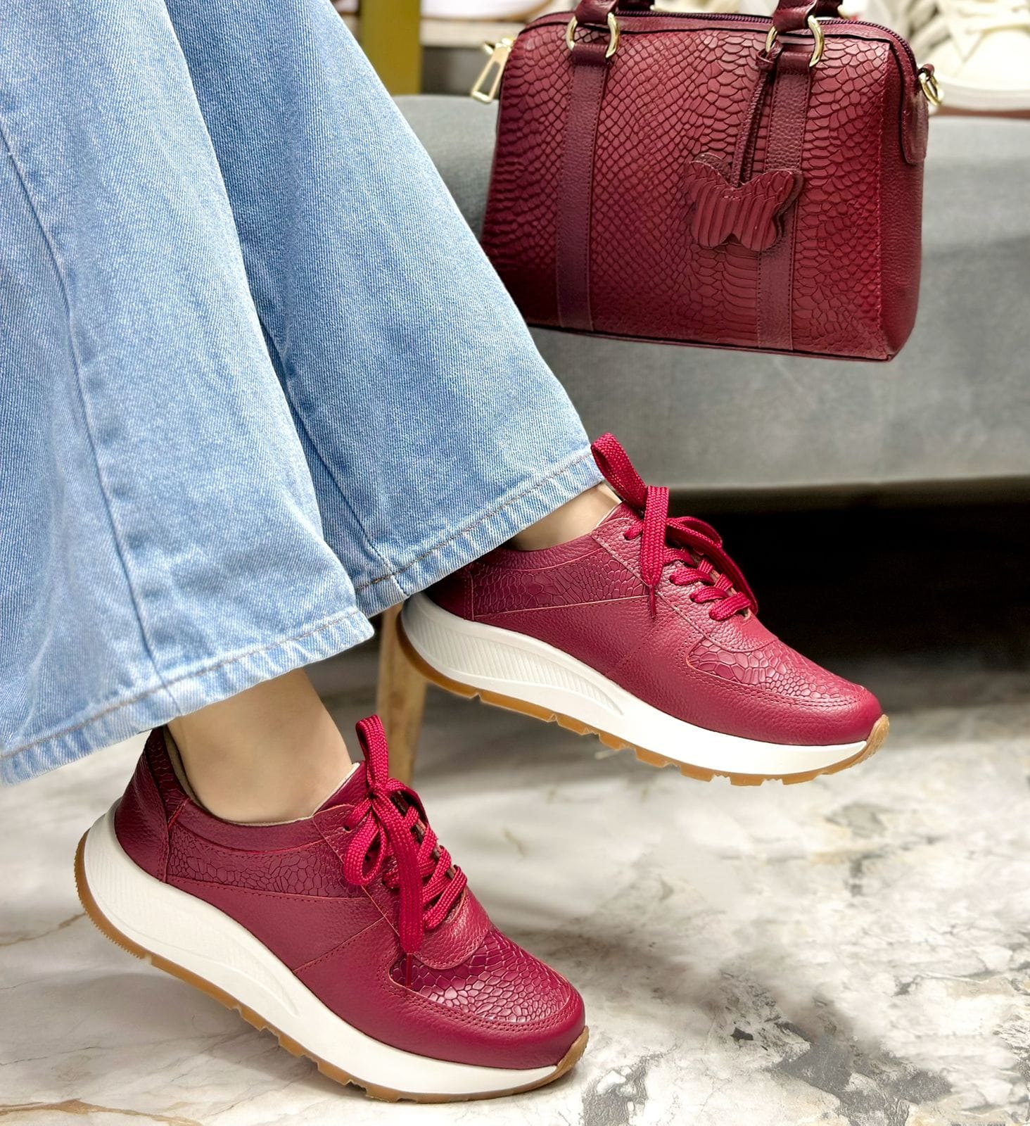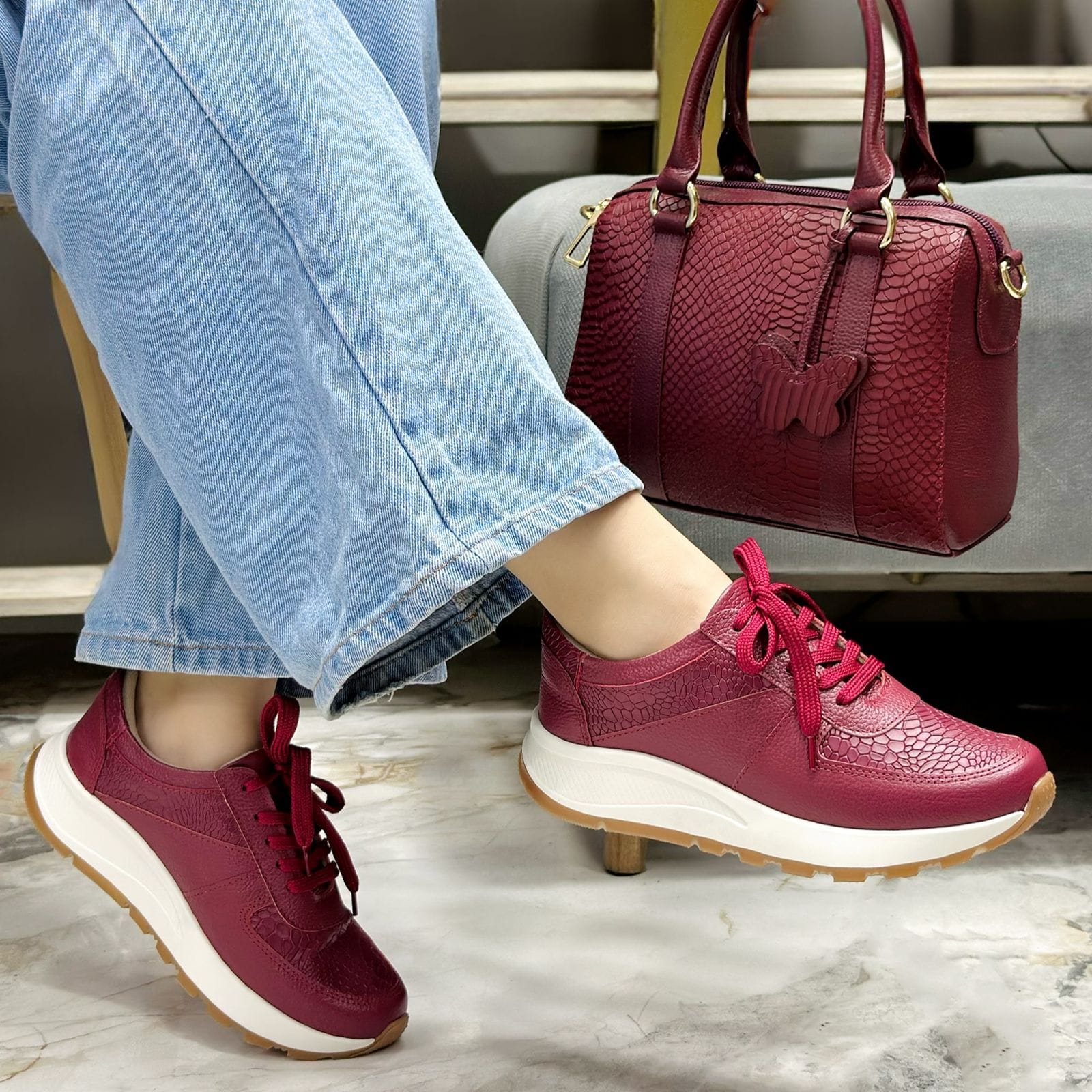 Los Tenis Susie Vinotinto. Su diseño  en color Luna, añadiendo un toque audaz que destaca en cualquier look. Además, estos tenis están equipados con un abullonado interior que proporciona una mayor comodidad en cada paso, convirtiéndolos en el aliado ideal para el uso diario. Susie redefine la moda casual con un estilo único y un confort excepcional.