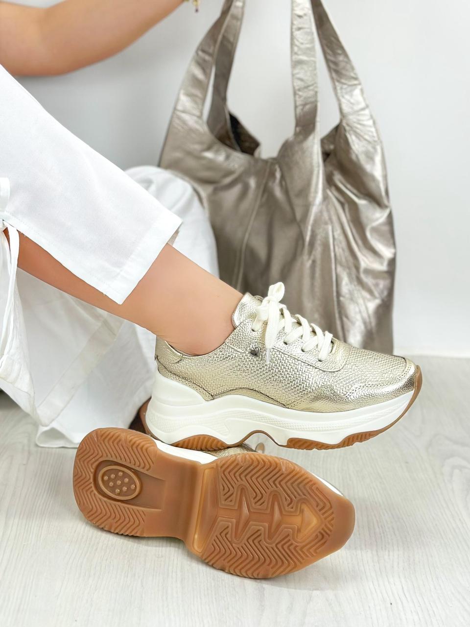 El tenis Vibra Dorado Ilusión destaca por su diseño moderno con acabado dorado metálico que aporta un toque sofisticado y llamativo a cualquier look; cuenta con una suela chunky de gran altura que brinda comodidad, estabilidad y excelente amortiguación, además de una suela antiderrapante en tono caramelo que garantiza seguridad en cada paso, convirtiéndolo en una opción versátil, cómoda y perfecta para un estilo casual con un toque glam.