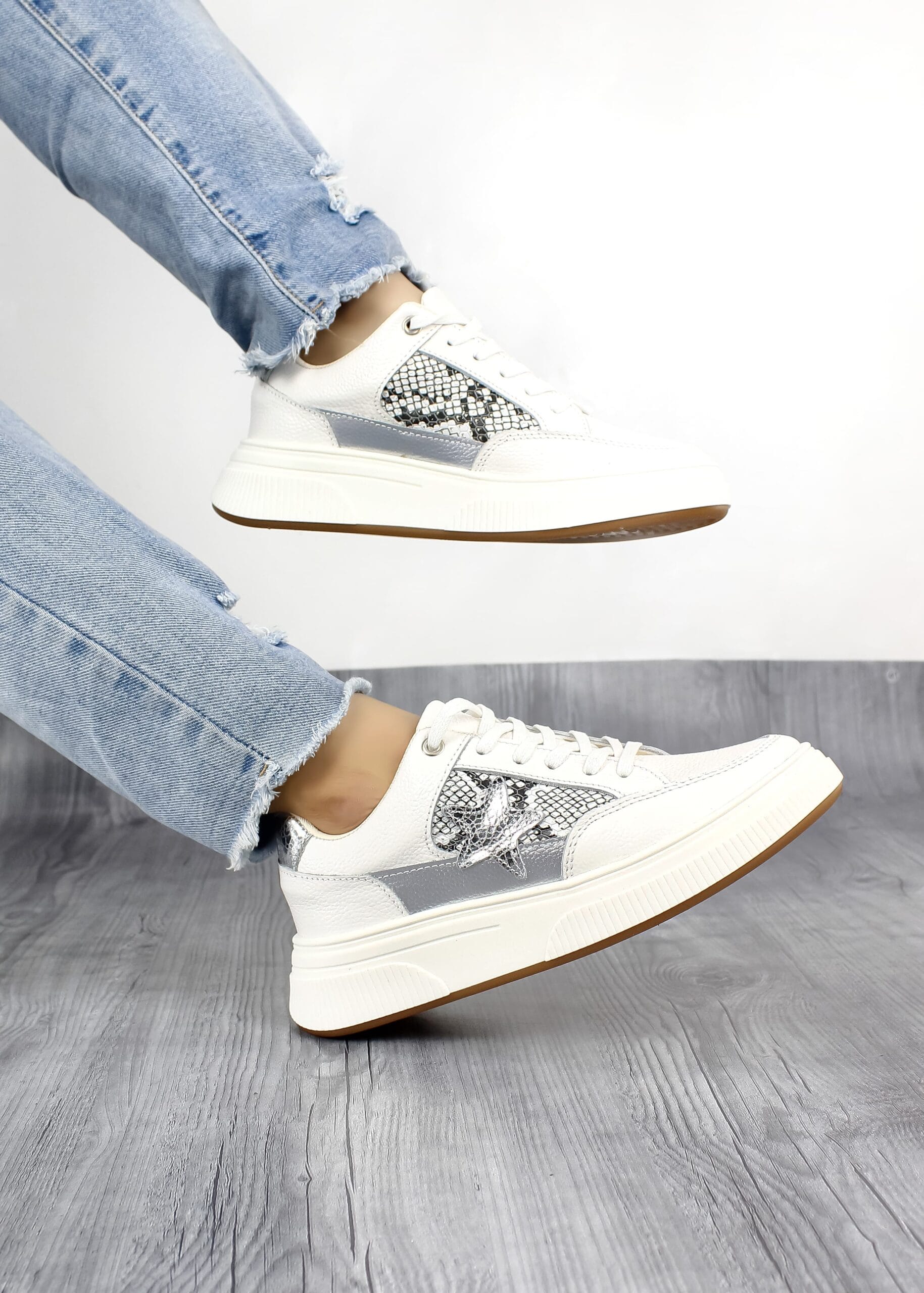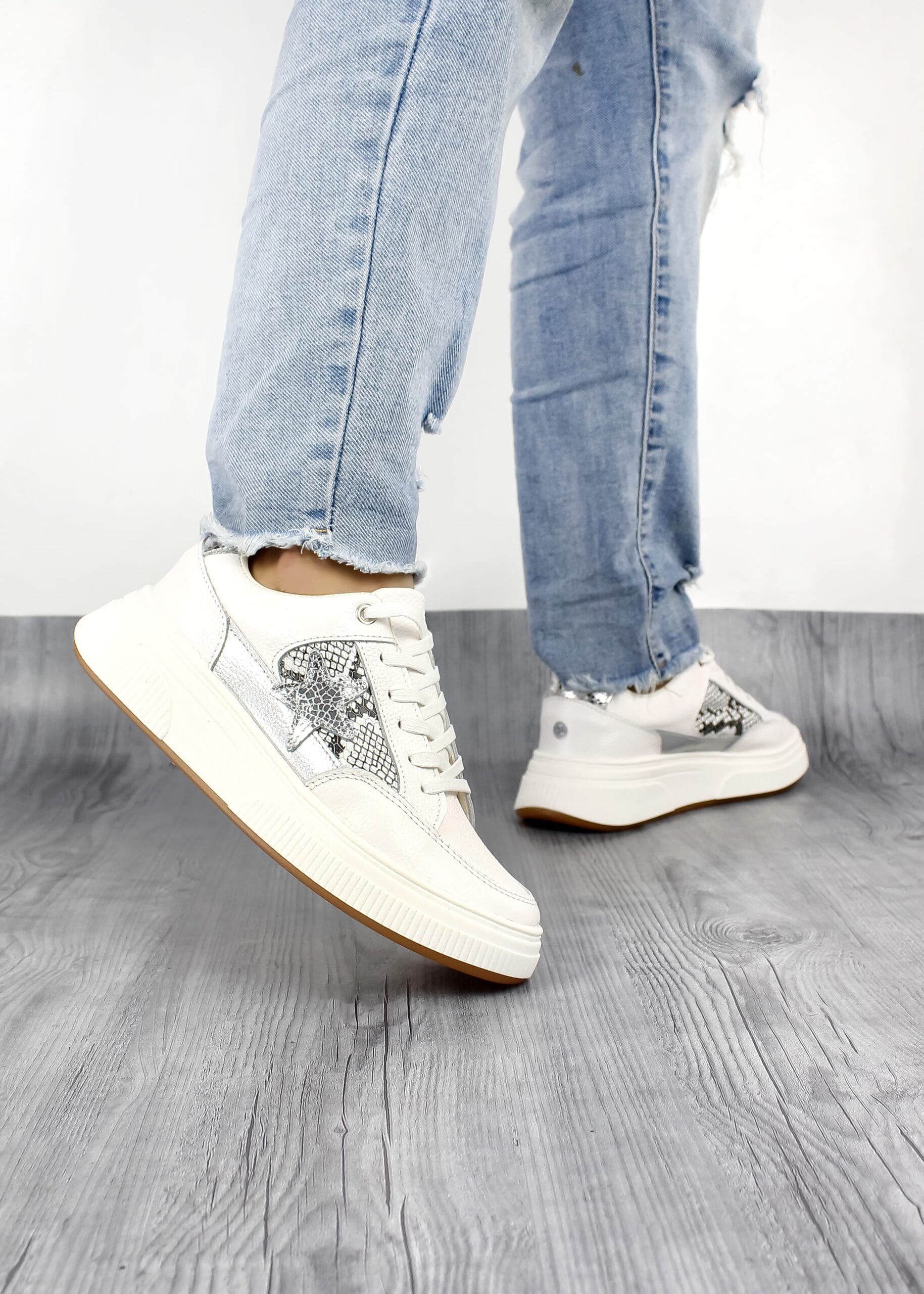 Los tenis Yuki en tonos Talco, plata y Folia son el equilibrio perfecto entre estilo y comodidad. Su confección en cuero con detalles abullonados en material sintético les da un acabado moderno y versátil, ideal para cualquier ocasión. Lo que los hace realmente especiales es su pequeña figura de estrella a cada lado, un detalle sutil pero encantador que añade un toque único y original a tu look diario.