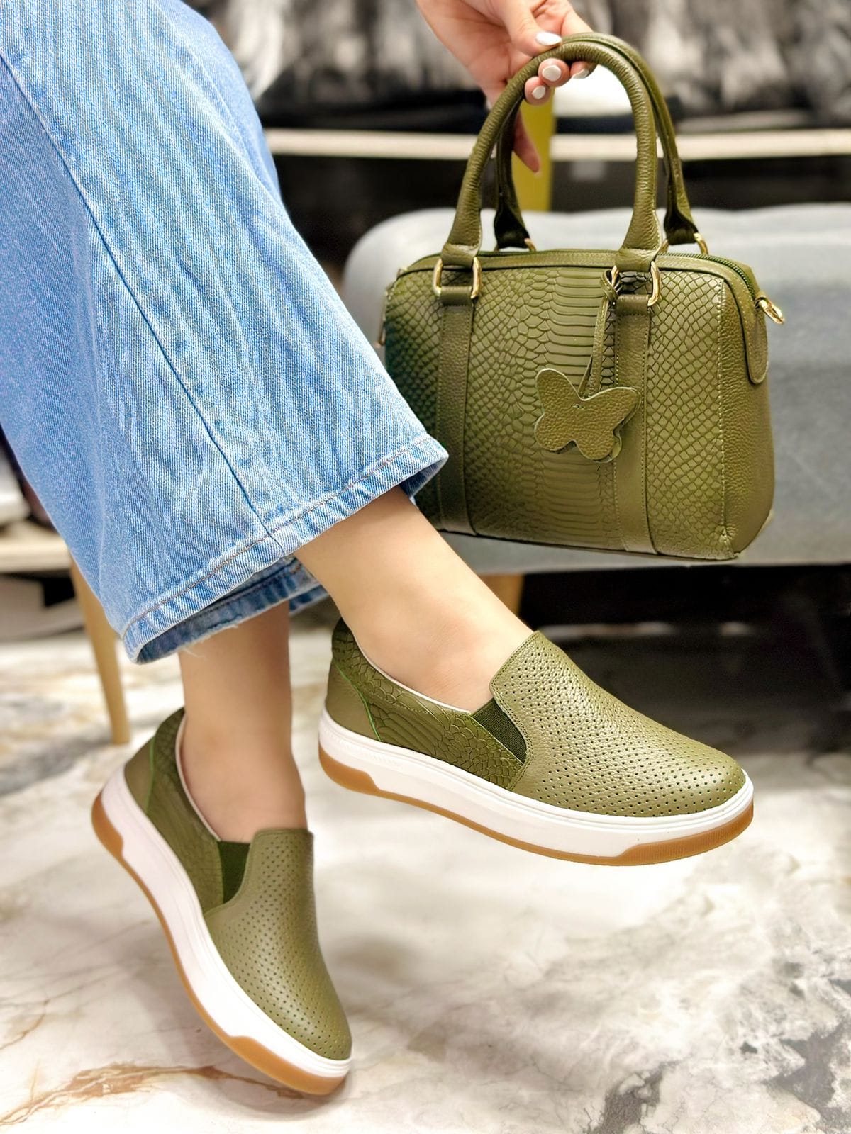 Tenis Zamira en color Verde, diseñados sin cordones para facilitar su postura y ofrecer máxima practicidad. Cuentan con pequeños resortes a ambos lados que permiten un ajuste cómodo y seguro al pie. Están elaborados en cuero de alta calidad, y en su interior incorporan un suave abullonado en material sintético que proporciona una sensación de confort superior, ideal para el uso diario con estilo y comodidad.
