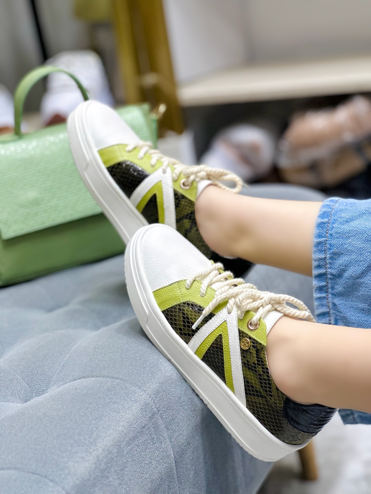 Este tenis en cuero presenta un diseño moderno y llamativo con combinación de texturas y colores. La base está elaborada en cuero con acabado tipo piel de serpiente en tonos verde oscuro y oliva, aportando un toque exótico. La puntera y las franjas laterales en forma de “V” están confeccionadas en cuero liso color crema, que contrasta y equilibra el diseño. En la parte frontal y laterales se añade un panel de cuero verde clarito, que da un acento vibrante. El talón está cubierto en cuero negro texturizado, y la suela, en tono crema uniforme, es ancha y lisa para un estilo casual y cómodo. Los cordones son trenzados en color marfil, completando el look con un aire fresco y versátil.